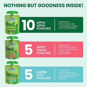 • Stock up on this variety pack of 20, 3.2 ounce GoGo squeeZ Fruit on the Go, (10) Apple Apple, (5) Apple Peach & (5) Gimme Five! unsweetened applesauce pouches, is kitchen pantry safe (no refrigeration required)